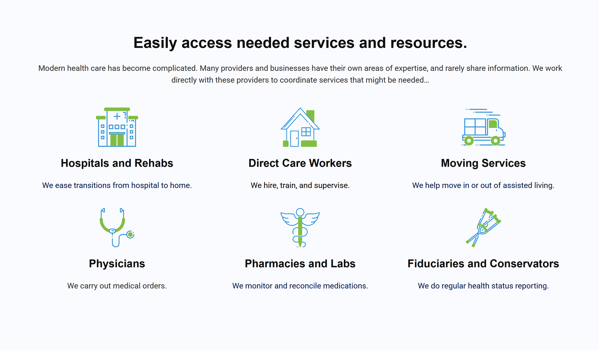 As an elder care management company, the client wanted to make the website welcoming and easy-to-use for seniors and their families. Showcasing photos of older people living independent and dignified lives was a high priority, as well as accesibility features like high-contrast color schemes, large readable text, and an easy-to-navigate user interface.